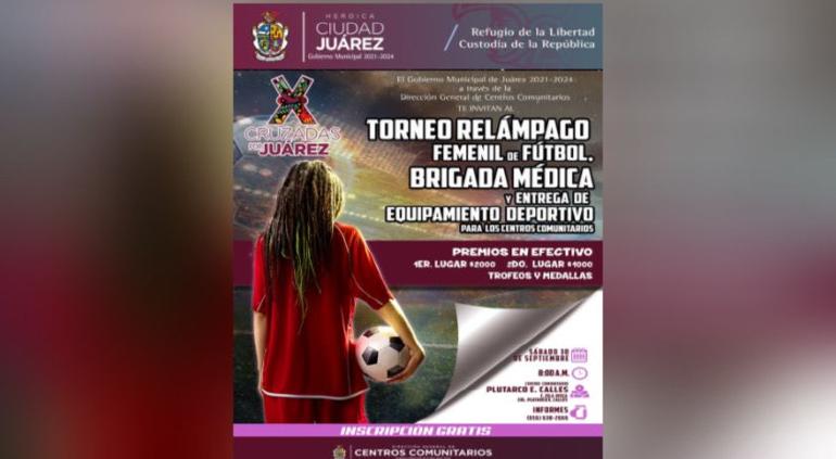 La Dirección de Centros Comunitarios invita a la ciudadanía a participar en el Torneo Relámpago de Futbol Femenil el próximo 30 de septiembre en el comunitario Plutarco Elias Calles.