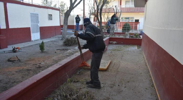 La Dirección de Parques y Jardines del Gobierno Municipal realizó trabajos de mantenimiento en la Primaria Adolfo López Mateos, ubicada en la colonia Del Real, informó el titular de la dependencia, Daniel Iván Zamarrón Saldaña.