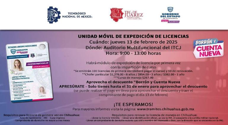 La Coordinación Estatal de Licencias llevará este día su unidad móvil al Instituto Tecnológico de Ciudad Juárez, donde ofrecerá el servicio de expedición de licencias de conducir, tanto para renovación como para aquellos que la tramitan por primera vez. El módulo estará disponible a partir de las 9:00 de la mañana y operará hasta agotar existencias.