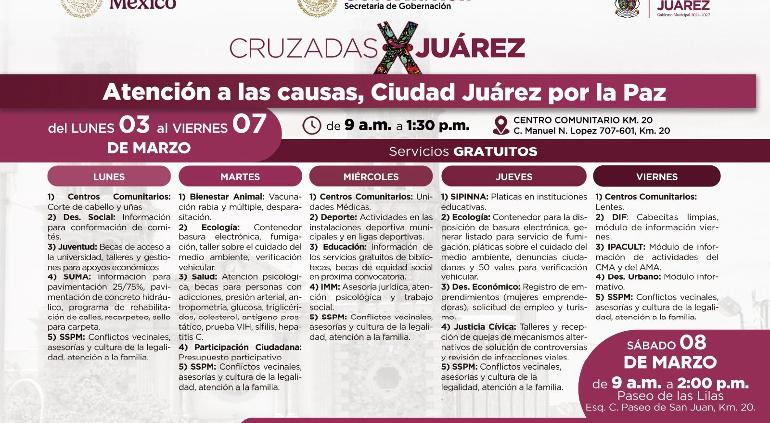 El próximo sábado 8 de marzo, de 9:00 de la mañana a 2:00 de la tarde, se realizará la segunda edición de la Cruzada por Juárez: Atención a las Causas, Juárez por la Paz. El evento tendrá lugar en el parque de la colonia Kilómetro 20, ubicado en Paseo de las Lilas y Paseo de San Juan.