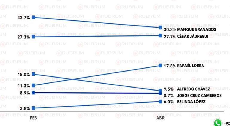 Según los datos, Manque Granados encabeza las preferencias con un 30.3% de apoyo, seguido de cerca por César Jáuregui con 27.7% y Rafael Loera con 17.8%. Estos tres candidatos concentran más del 75% de las intenciones de voto dentro del PAN, dejando a los demás aspirantes —Alfredo Chávez (9.5%), Jorge Cruz Camberos (8.7%) y Belinda López (6.0%).