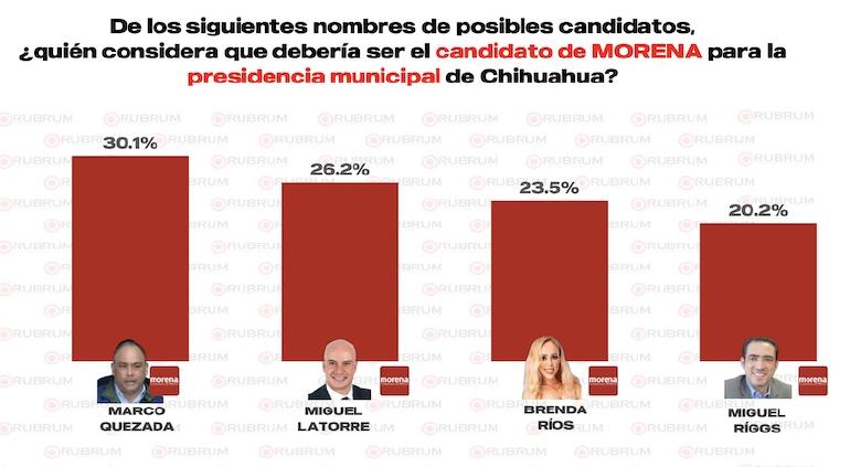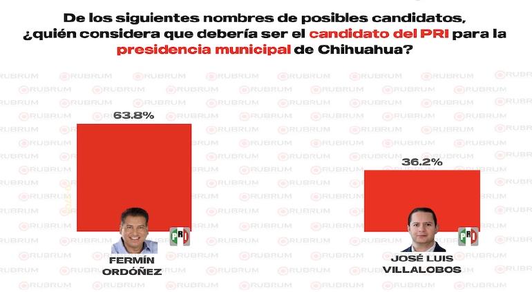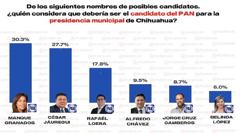 La encuestadora Rubrum reveló las preferencias de los votantes respecto a los posibles candidatos a la presidencia municipal de Chihuahua por los principales partidos políticos, así como las intenciones de voto por partido. En el caso del Partido Acción Nacional, los nombres de Manque Granados, César Jáuregui y Rafael Loera destacan como favoritos.