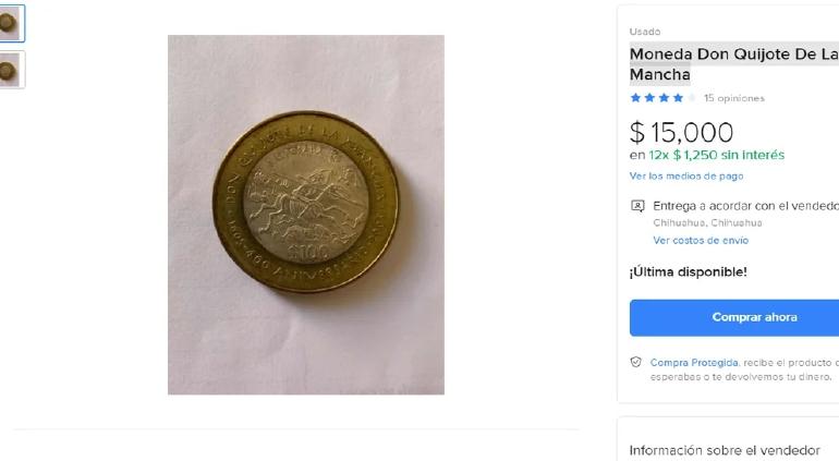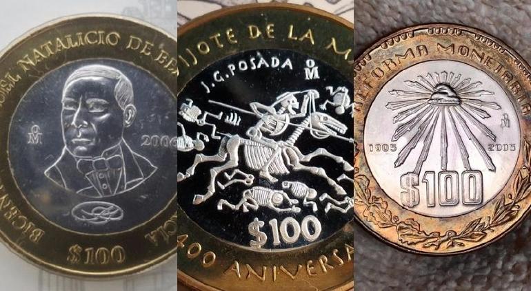 La primera moneda es la pieza conmemorativa del aniversario 400 de la primera edición de Don Quijote de la Mancha, fue acuñada en el 2005 y su arte fue diseñada por el caricaturista mexicano, José Guadalupe Posada, quien representó en el reverso de la moneda la obra titulada “Calavera Quijotesca”. Llegá a costar hasta 15 mil pesos en Mercado Libre.