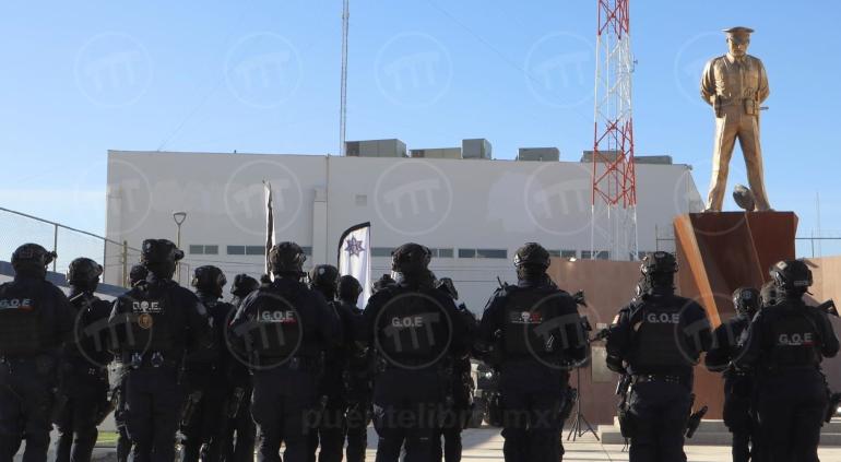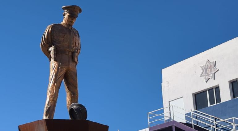 El presidente municipal, Cruz Pérez Cuéllar, y el secretario de Seguridad Pública, César Omar Muñoz, también hicieron su guardia de honor en el monumento al policía caído, tras colocar la ofrenda floral.