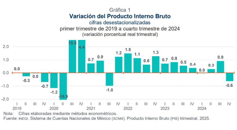 El Instituto Nacional de Estadísticas y Geografía (Inegi) anunció que el Producto Interno Bruto (PIB) de México sufrió un retroceso del 0.6% durante el último trimestre (octubre-diciembre) del 2024, lo cual se trata del peor dato en los últimos tres años.
