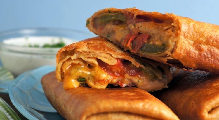 -Dispón en una tabla una tortilla de trigo, rellena con dos cucharadas colmadas de relleno, pon por encima el queso para fundir y ciérrala como un burrito, bien apretado.