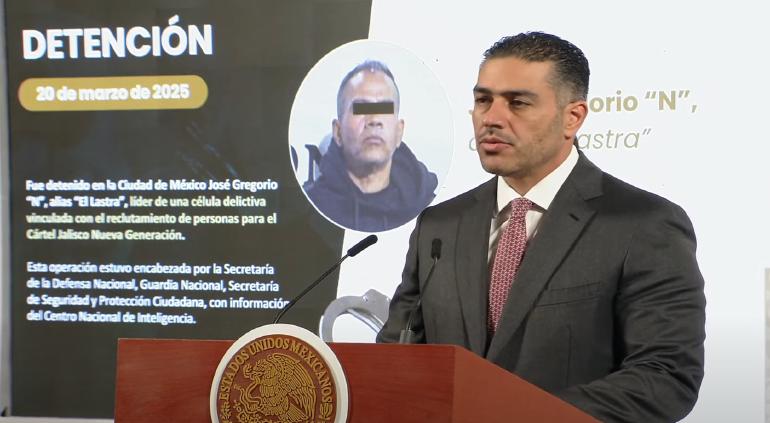 En la Conferencia de el Pueblo, informó de la detención en la Ciudad de México de José Gregorio N., alias “Lastra” o “Comandante Lastra”, señalado como líder de una célula delictiva encargada del reclutamiento para el CJNG.