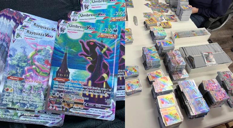 No quedó ahí. En su regazo tenía el presunto vendedor decenas de copias de Rayquaza Vmax arte alternativo valuado en unos 340 dólares (más de 6 mil 140 pesos cada una), así como decenas de Umbreon Vmax arte alternativo, de casi 700 dólares (más de 12 mil pesos cada uno).