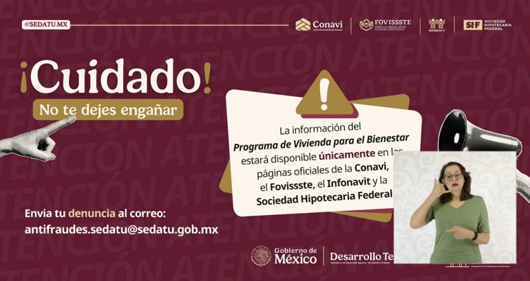 Finalmente, la dependencia reiteró que las denuncias por fraudes pueden enviarse al correo antifraudes.sedatu@sedatu.gob.mx y llamó a consultar el sitio oficial viviendaparalbienestar.mx para verificar requisitos y trámites.