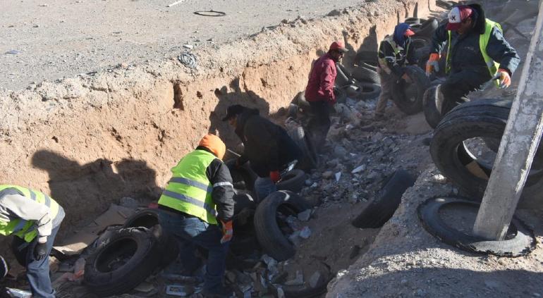 Trabajadores de la Dirección de Limpia siguen con labores para retirar llantas, basura y escombro del predio baldío ubicado en bulevar Talamás Camandari y San Isidro, donde detectaron una desponchadora y puesto de leña irregulares.