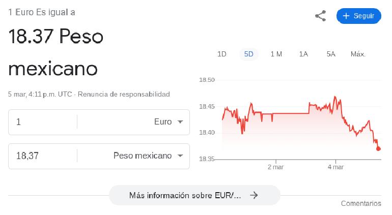 Al corte de las las 10:11 (hora del centro de México) este 5 de marzo, cotiza la moneda europea en 18.37 pesos.