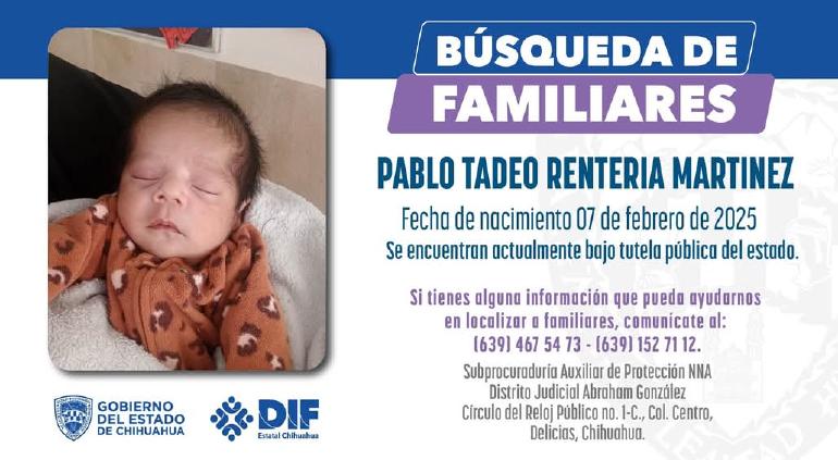 Las autoridades de Chihuahua han emitido una alerta para localizar a los familiares del niño Pablo Tadeo Rentería Martínez, nacido el 7 de febrero de 2025.