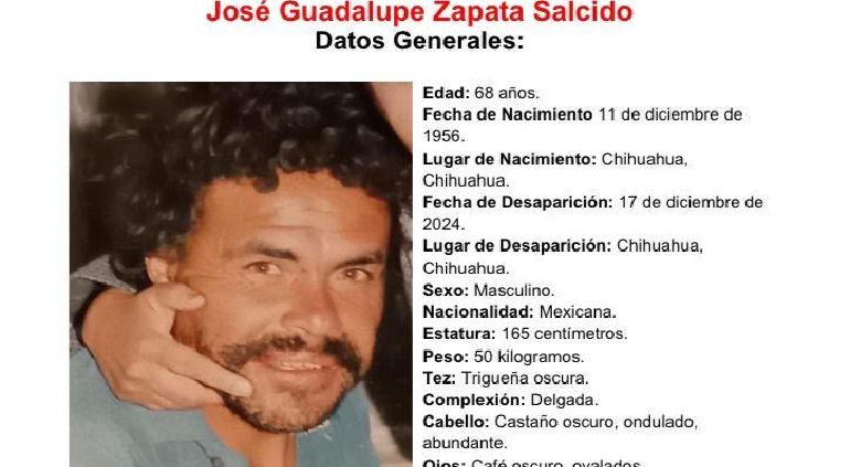 El ciudadano José Guadalupe Zapata Salcido, de 68 años de edad, desapareció el pasado 17 de diciembre en la ciudad de Chihuahua. Lo vieron por última vez en la colonia Junta de los Ríos.
