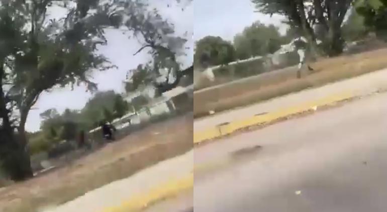 En las imágenes se puede ver cómo un sujeto en bicicleta y otro más que corría intentaban huir, justo detrás de ellos aparece un elemento de la Guardia Nacional.
